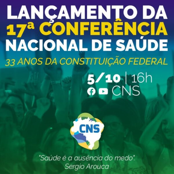 A 17ª Conferência Nacional de Saúde, maior encontro de Saúde no Brasil, será lançada hoje (05/10) às 16 horas. A data do lançamento foi escolhida por ser o aniversário de 33 anos da Constituição de 1988. Para maior segurança dos participantes, o evento será online e ao vivo nas páginas do Youtube e Facebook do Conselho Nacional de Saúde (CNS). A Conferência está prevista para ocorrer em 2023.