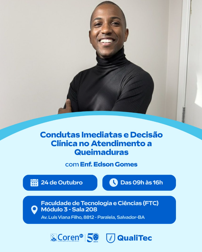 O Conselho Regional de Enfermagem da Bahia realizará na sexta-feira dia 24 de Outubro, mais um evento QualiTec com o tema “Condutas Imediatas e Decisão Clínica no Atendimento a Queimaduras” que será ministrado pelo Enfermeiro Edson Gomes.